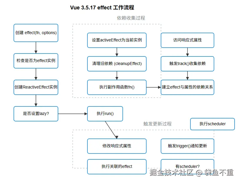 总之,Vue 3.5.17 中 effect 相关的机制通过 ReactiveEffect 类、依赖收集、触发更新、调度器等一系列设计,构成了一个功能强大且灵活的响应式系统,为 Vue 应用的数据响应式更新提供了坚实的基础 。