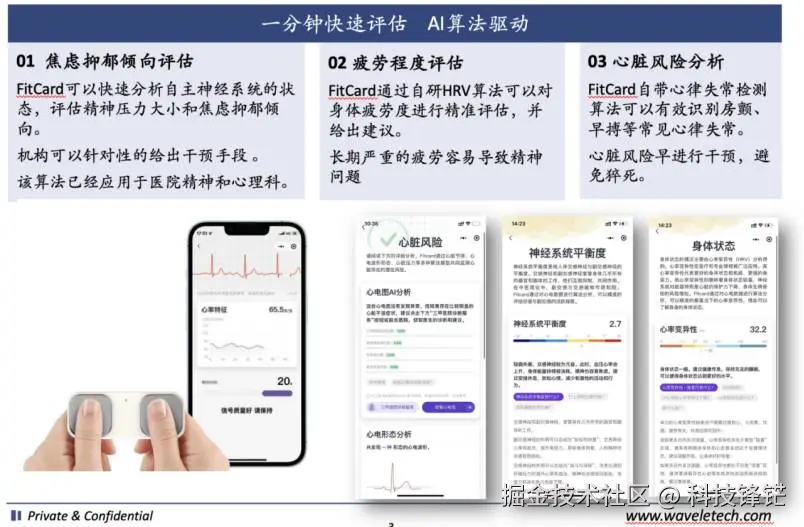 认可的技术路线。唯理作为国内第一个将医疗级心电图采集芯片国产化的公司,利用自身技术优势,将评估筛查的时间缩短至1分钟,相比之下,进口的精神压力分析通常需要5分钟左右。