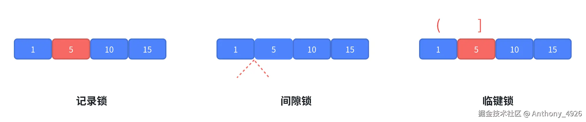 如下图,有1、5、10、15四个记录,红色表示被加上了锁。