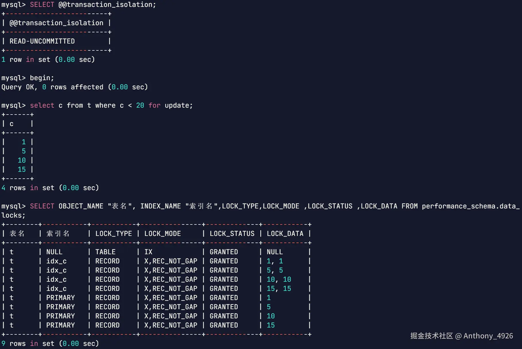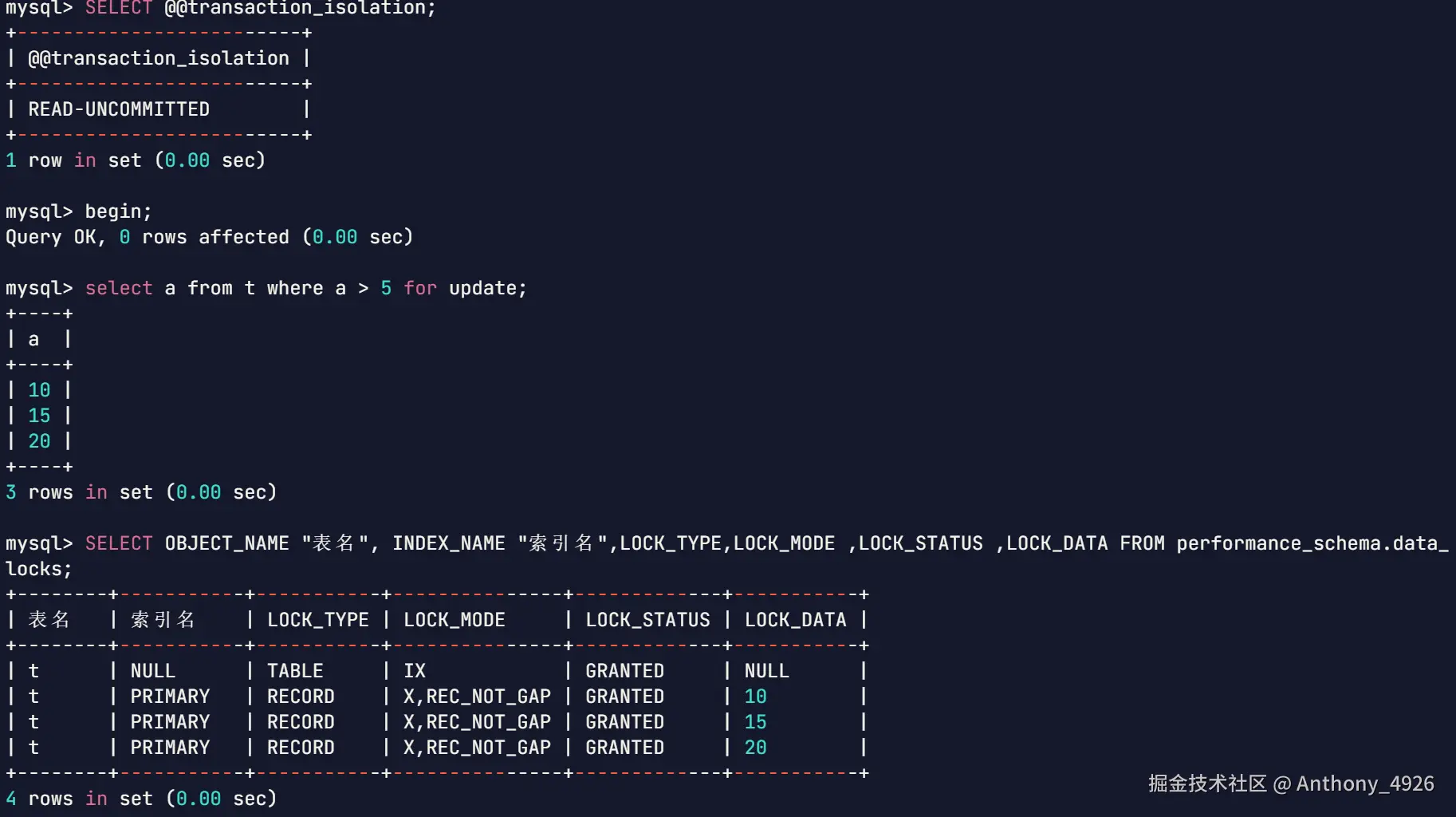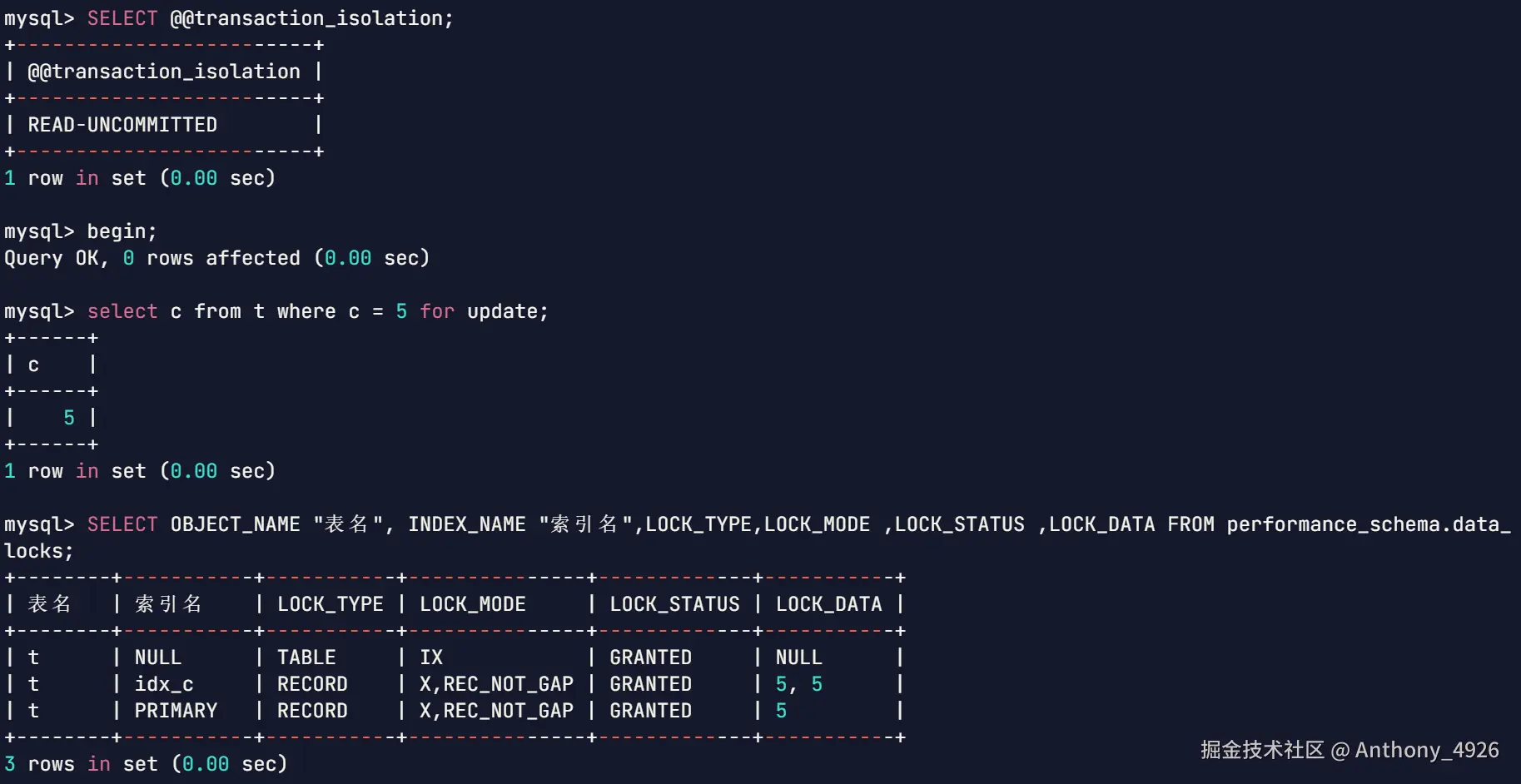 | 1 | begin;select a from t where c = 10 for udpate; | |