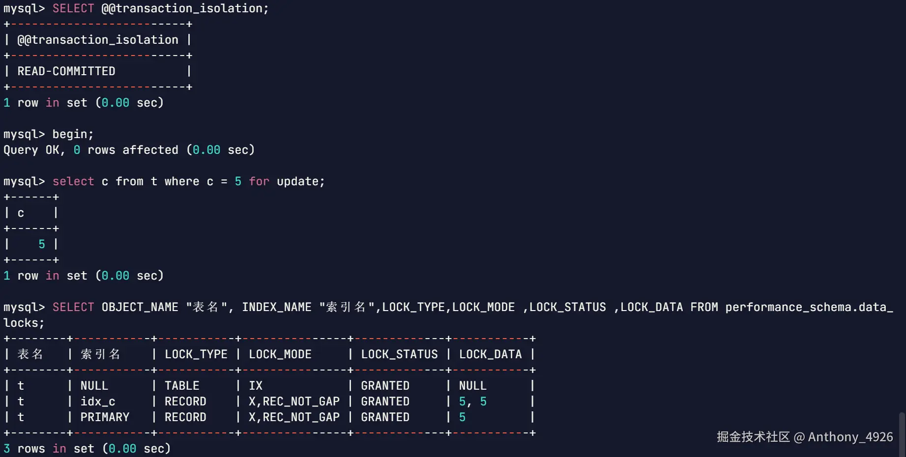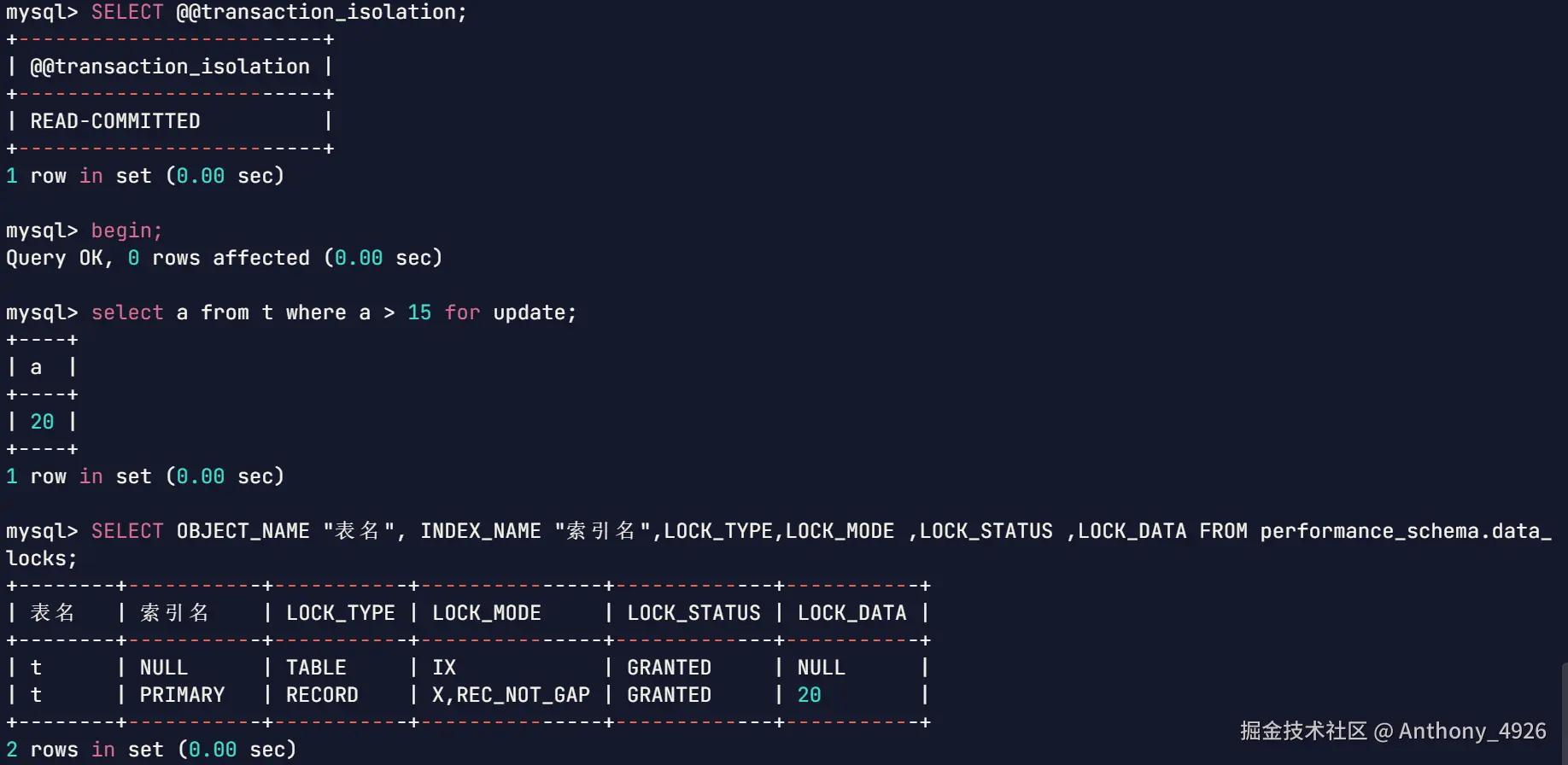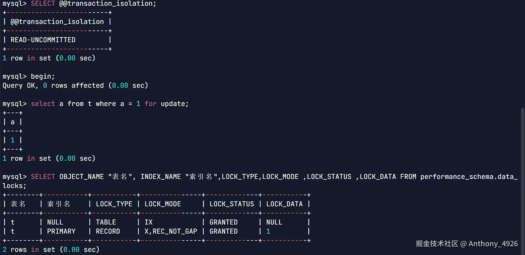 | 1 | begin;select a from t where c = 10 for udpate; | |