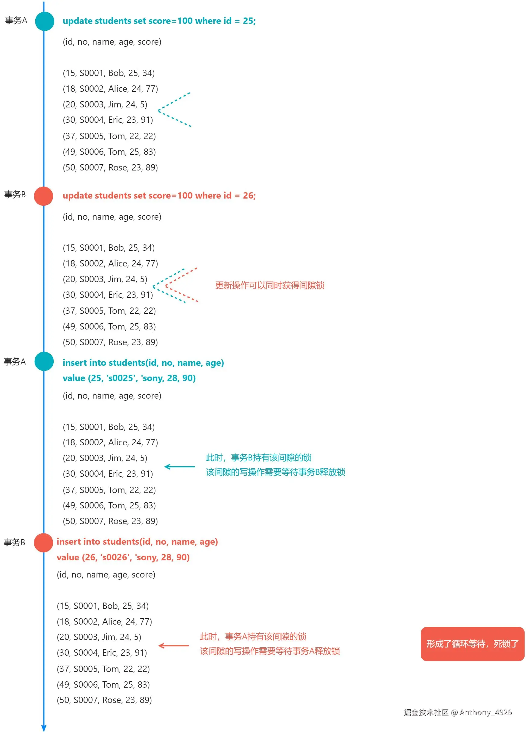 可重复读隔离级别下,考虑以下执行步骤,为什么会发生死锁