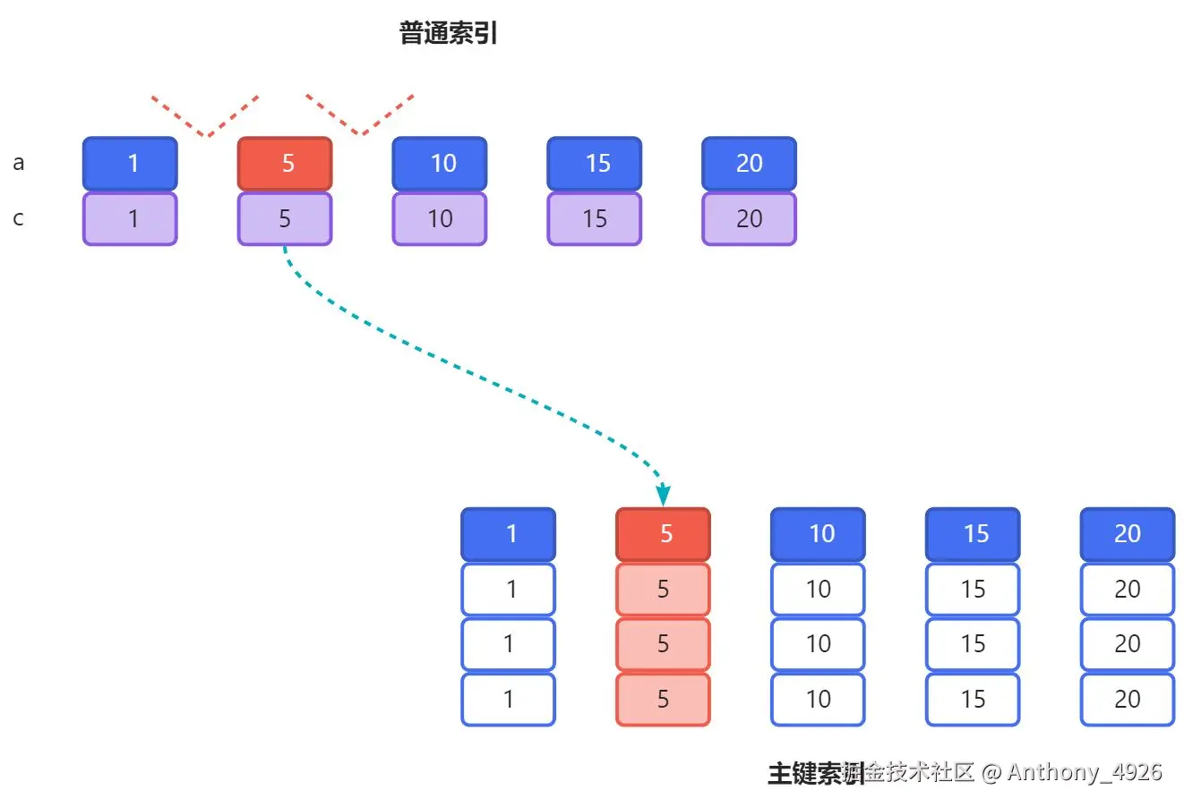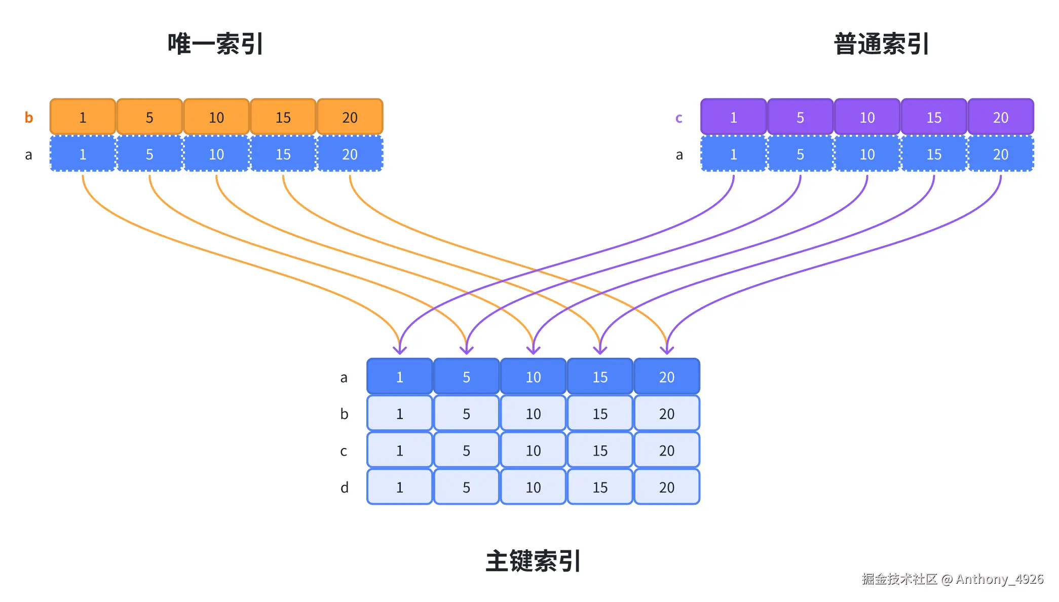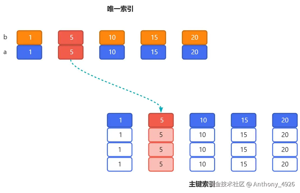 主键索引必然会存在,即便是没有为表设置主键(此时Innodb会生成默认的自增主键)。唯一索引和普通索引最终都会指向主键索引,典型的例子是回表查询,因为主键索引中是包含着全表数据的。如果用图形表示的话,可以表示为如下样子