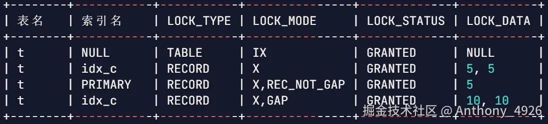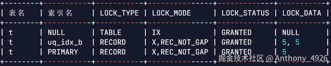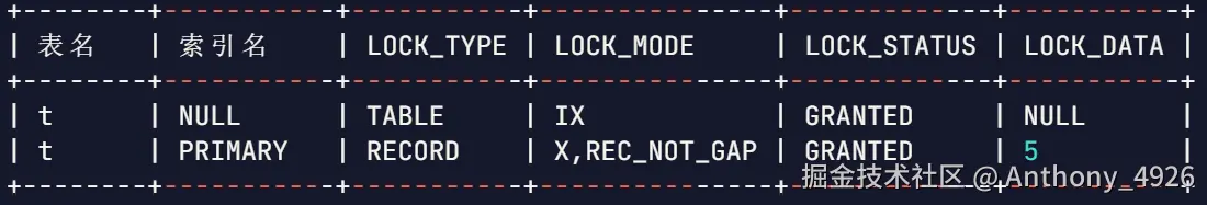 最终,加锁的结果是,在主键索引上加一个记录锁X,没有间隙,锁住的数据是5。当然还有表级的意向锁IX