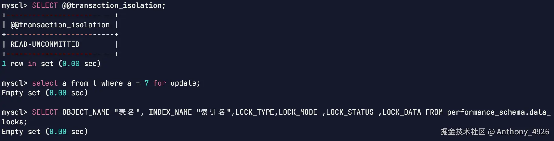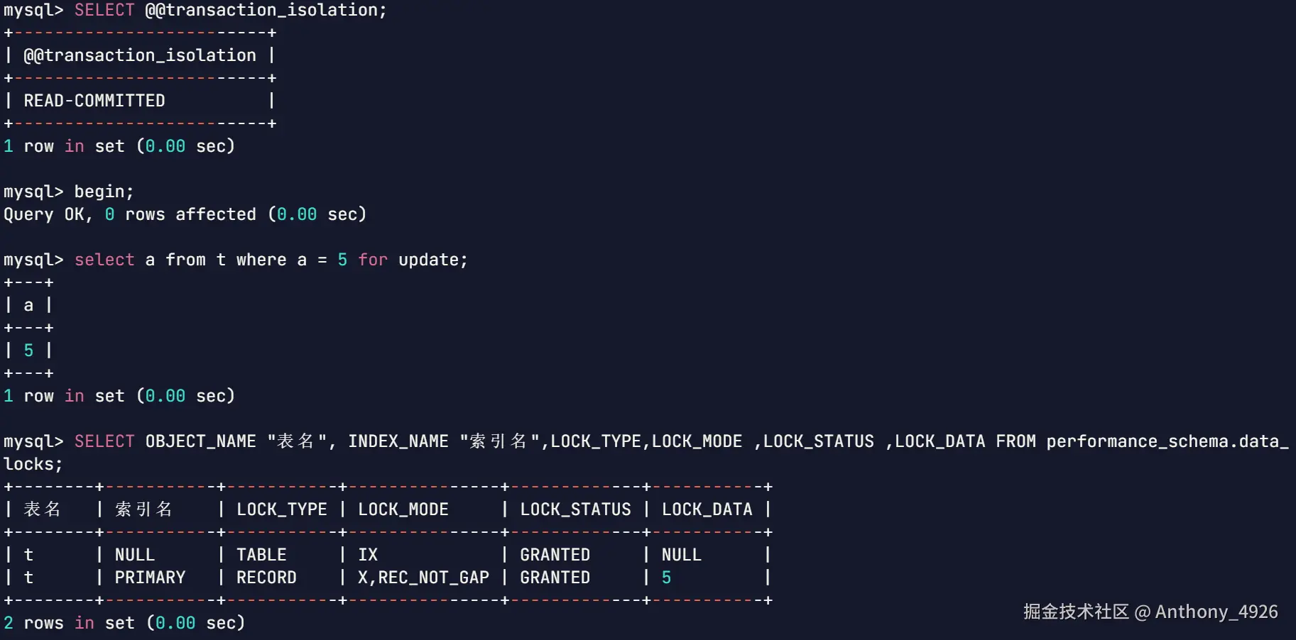 - performance_schema:是一个用于监控和分析数据库运行时性能的系统数据库。它存储了实时性能数据和服务器内部执行信息,例如锁信息。同样是本文开始,介绍了如何查看表被加了哪些锁,就是从
