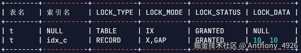 - 意向锁(IX、IS) :这里简单记,后边会细说。当一个表中有行锁时,这个表就会被添加一个标记,标识这个表有行锁存在。这个标记就是意向锁。其中IX表示 意向写锁,IS 表示 意向读锁。