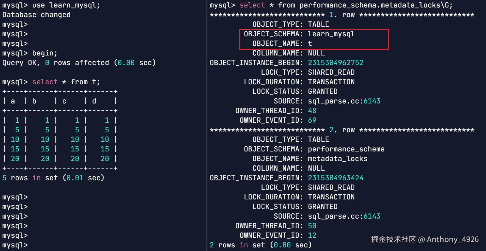 为什么右侧会查出两行锁记录?因为这些数据时从表performance_schema.metadata_locks查出来,执行查询语句时,也会给这个表加元数据锁。