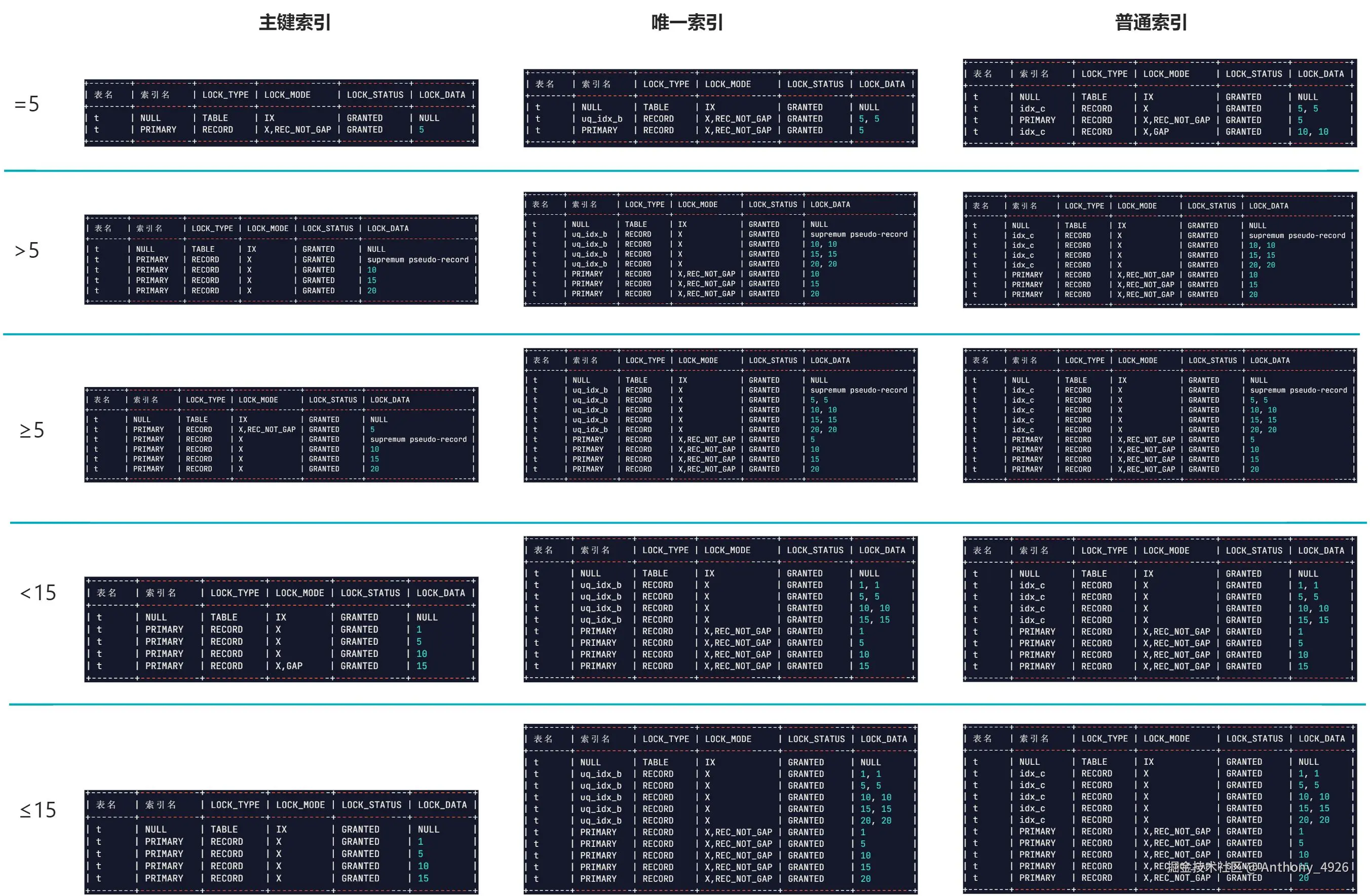 | 锁的范围 | - 锁定索引值之间的间隙,而非具体的索引值。例如,若表中有索引值 10 和 20,间隙锁可能锁定区间 (10, 20)、(-∞, 10) 或 (20, +∞)。 |