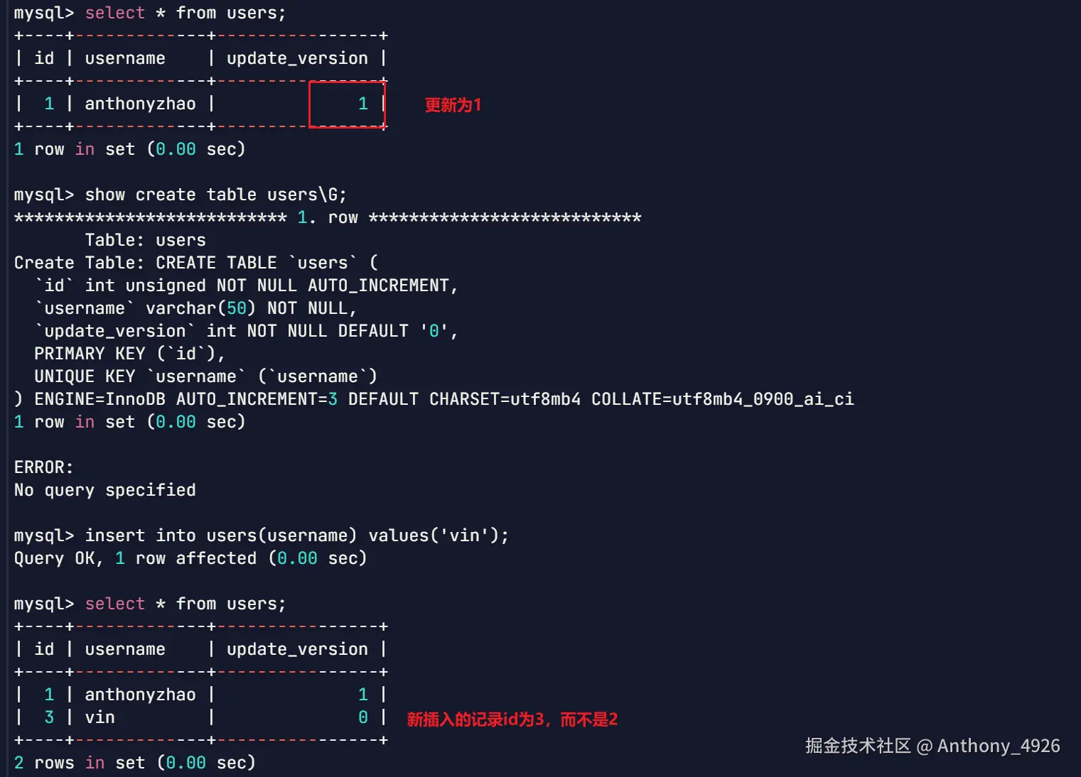 replace into users (id, name) values (1, 'anthonyzhao');load data 语句| | 混合额插入 | 部分指定了自增键,部分未指定自增键-insert into user(id, name) values(null, 'Alice'),(3, 'Bob');|