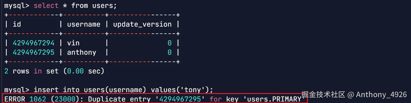 - 建表时显示设置自增了id:达到最大值4294967295后,再插入数据自增值也不再增加了,插入数据会提示主键冲突