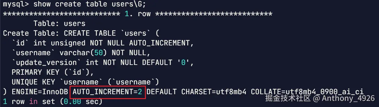 插入数据后可以通过建表语句来查看当前自增值。自增值是一个单独的变量auto_increament,插入语句执行前直接将auto_increament的值分配给插入语句,然后变更auto_increament。如下图,下一个插入语句得到的自增值将会是2。