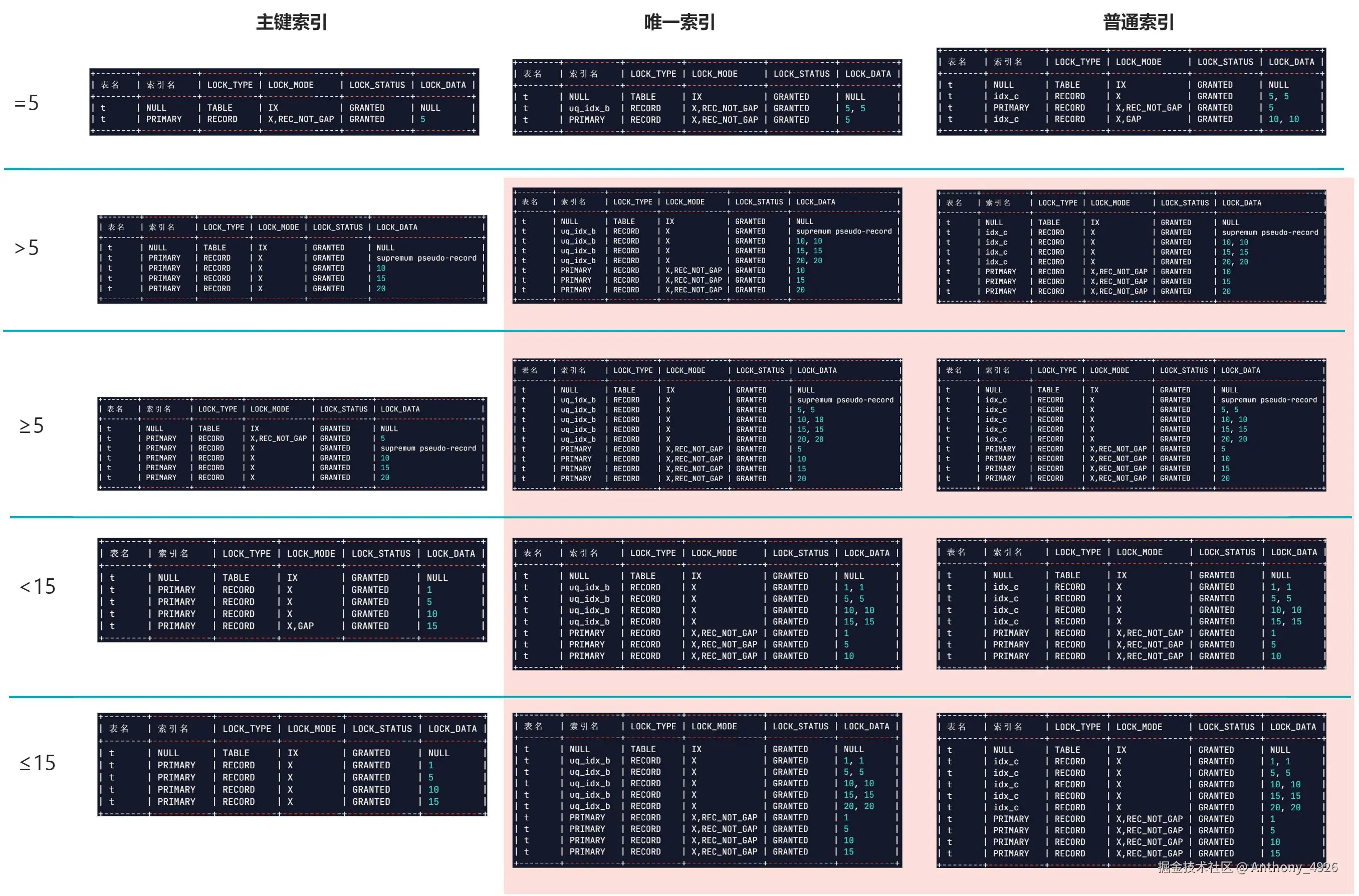 但是,在对应的主键索引上是会优化的,没有必要锁住20这个记录,因此主键索引上对应的枷锁结果为