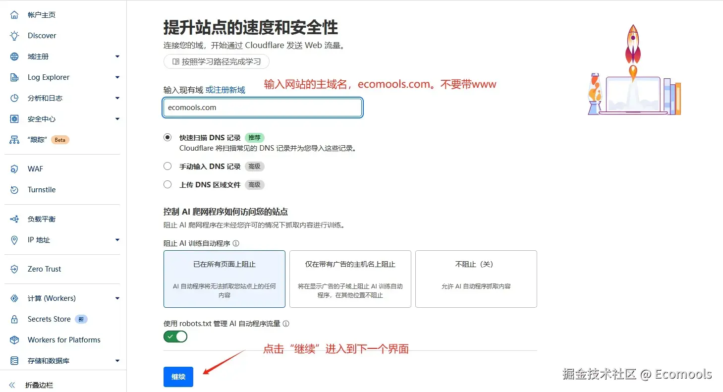 然后输入我们的根域名,选择“快速扫描DNS记录”,让Cloudflare自动扫描我们的DNS记录即可。