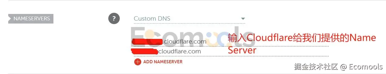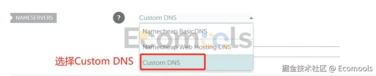 然后找到“NAMESERVERS”选项卡,打开下拉框,选择“Custom DNS”。