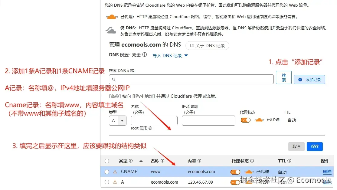 - @ 代表主域名,比如 @ 就表示 ecomools.com。这条记录添加 A 记录,指向我们的服务器公网 IP。