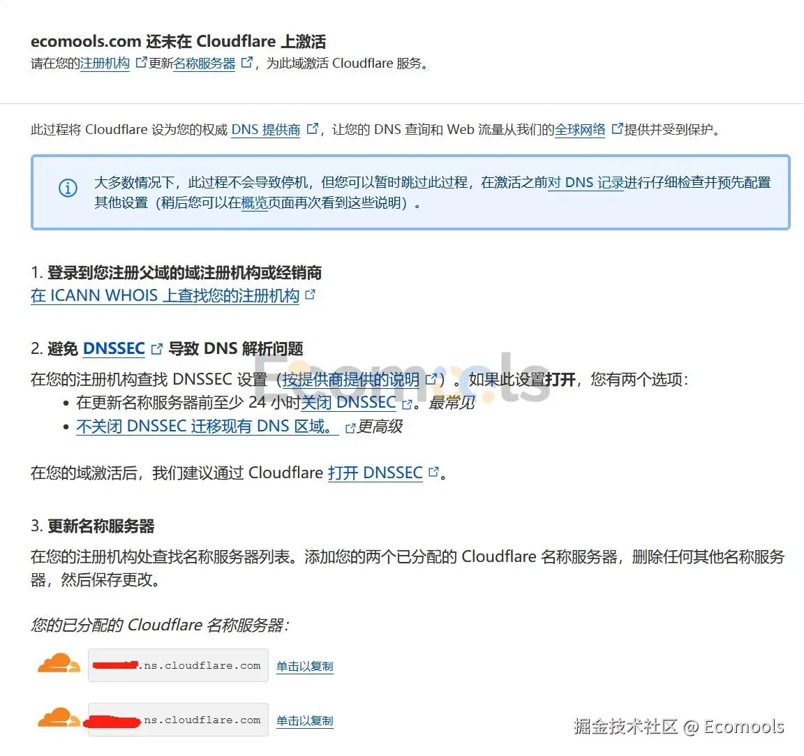 添加完这两条记录以后,点击“继续前往激活”进入到以下界面。这是Cloudflare给我们提供的名称服务器(也称域名服务器)。我们后续需要在域名注册商中将域名服务器改为Cloudflare的。