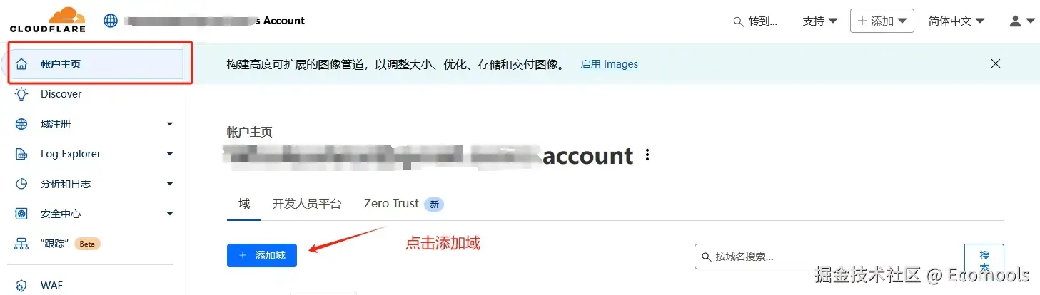 登录到后台,在账户主页中,我们点击“添加域”来添加我们的站点: