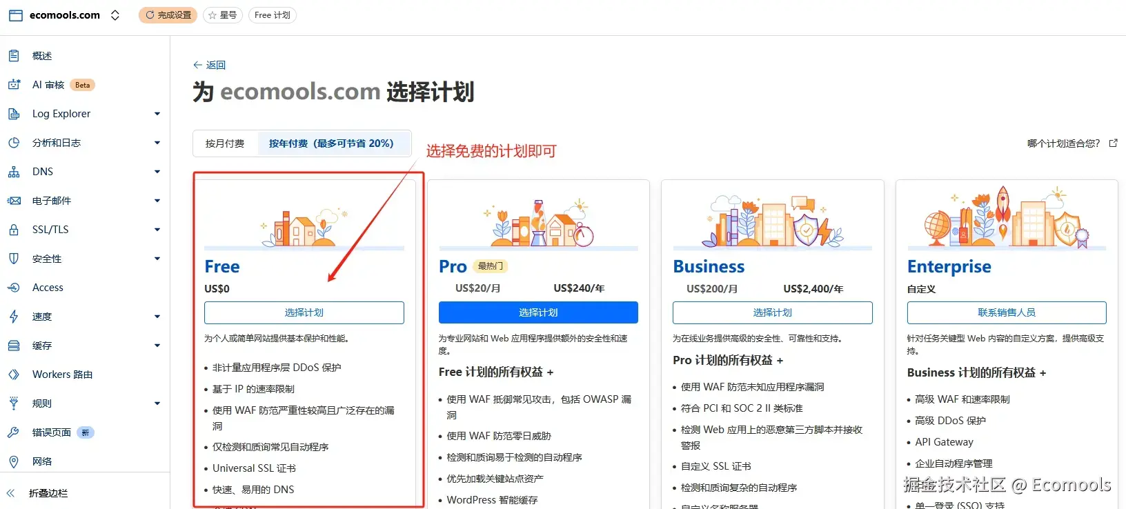 点击“继续”后选择我们的计划,这里选择免费的计划即可。
