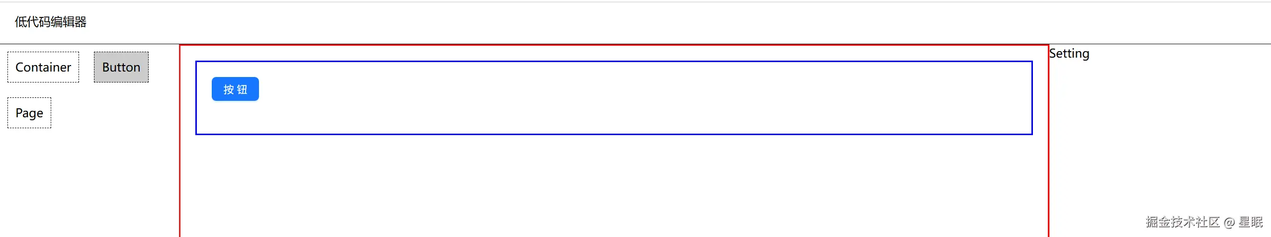 至此,拖拽效果实现,接下来进行Page和Container容器组件的配置,使其能够盛放子组件,从而达到将物料区组件拖拽并放置在画布区内的效果