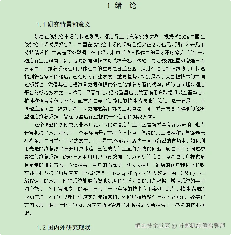 随着在线旅游市场的快速发展,酒店行业的竞争愈发激烈。根据《2024中国在线旅游市场发展报告》,中国在线旅游市场的规模已经突破2万亿元,预计未来几年将持续增长,尤其是经济型酒店在年轻人和中低收入群体中的需求不断攀升。近年来,酒店行业逐渐意识到,借助数据和技术可以提升客户体验、优化资源配置和增强市场竞争力。而推荐系统在用户体验中的重要性日益凸显,通过个性化推荐帮助用户快速找到符合需求的酒店,已经成为行业发展的重要趋势。特别是基于大数据技术的协同过滤算法,凭借其在处理海量数据和提供个性化推荐方面的优势,成为越来越多酒店平台的核心技术之一。然而,尽管如此,经济型酒店仍然面临用户数据难以全面整合、推荐准确度偏低等挑战,亟需通过更加智能化的推荐系统进行优化。这一背景下,本课题应运而生,致力于基于大数据框架和协同过滤算法,设计并开发高效精准的经济型酒店推荐系统,旨在为酒店行业提供一个创新的解决方案。