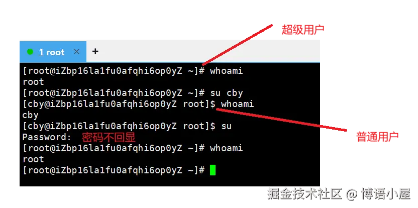 要从普通用户user切换到root用户则使用 su root(root可以省略),此时系统会提示输入root用户的密码。
