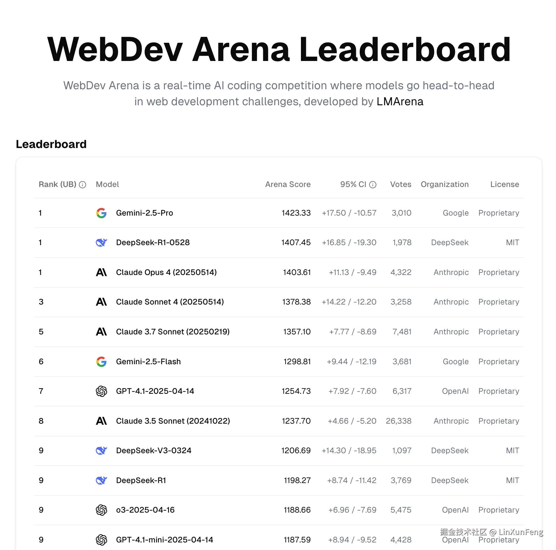 Gemini 2.5 Pro 在编码上的能力,我们可以参考 web.lmarena.ai/leaderboard 上查看排名。