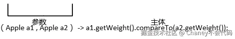 Comparator<Apple> c=(a1,a2)->a1.getWeight.compareTo(a2.getWeight());
