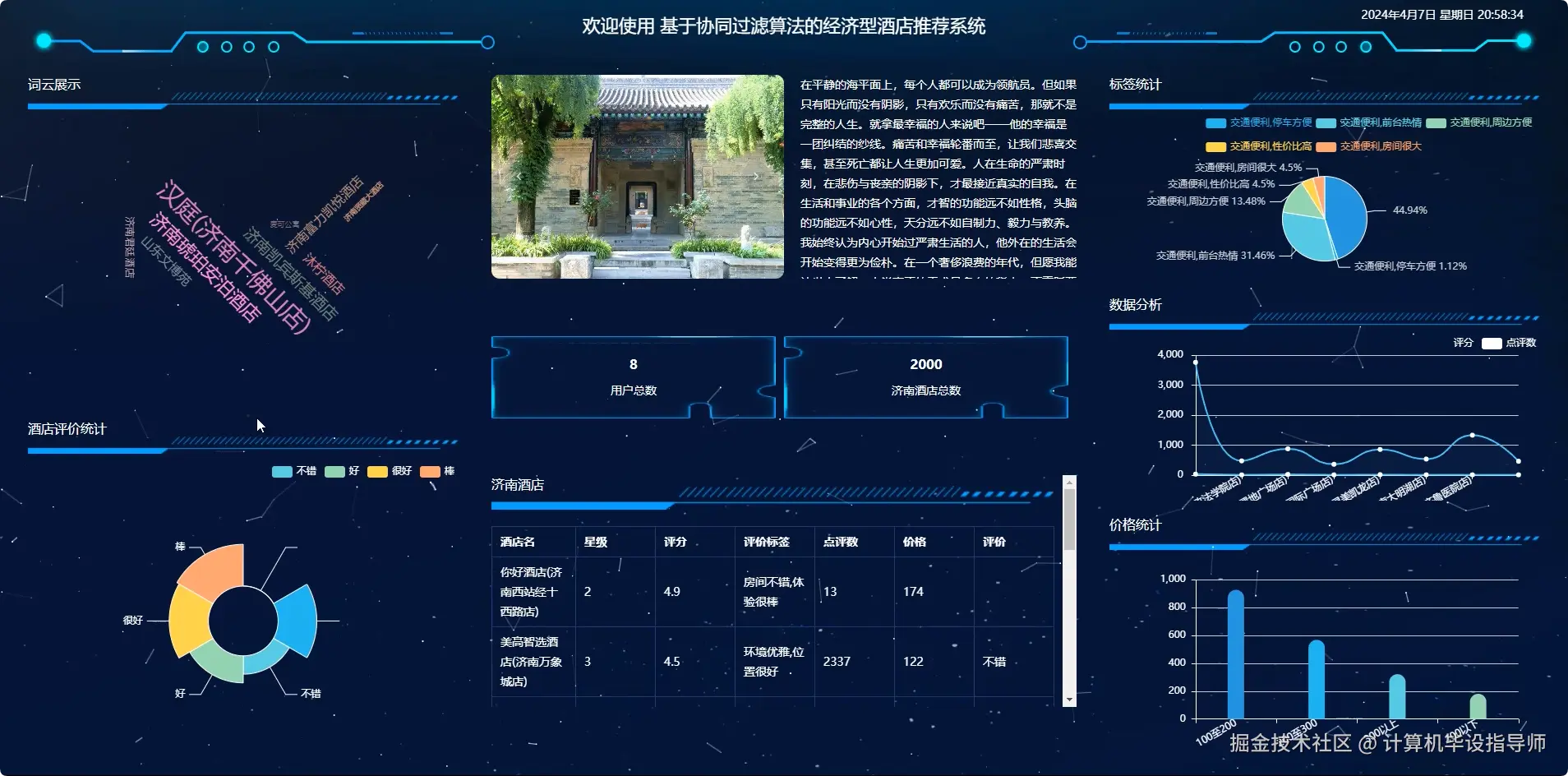 一、课题背景 在信息技术飞速发展的今天,互联网已成为人们获取信息、进行消费的重要渠道。旅游业的繁荣带动了酒店行业的快速发展,其中经济型酒店以其亲民的价格和便捷的服务受到广泛欢迎。然而,面对海量的酒店信息,消费者往往难以快速找到符合个人偏好的住宿选择。因此,如何利用先进的技术手段为用户提供个性化的酒店推荐,成为了一个值得探讨的问题。
