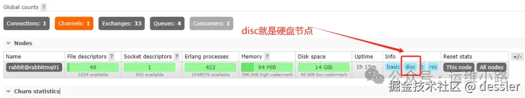 依赖磁盘节点: 内存节点本身无法持久化元数据。它依赖集群中的磁盘节点来持久化元数据,并在启动时从磁盘节点同步元数据。