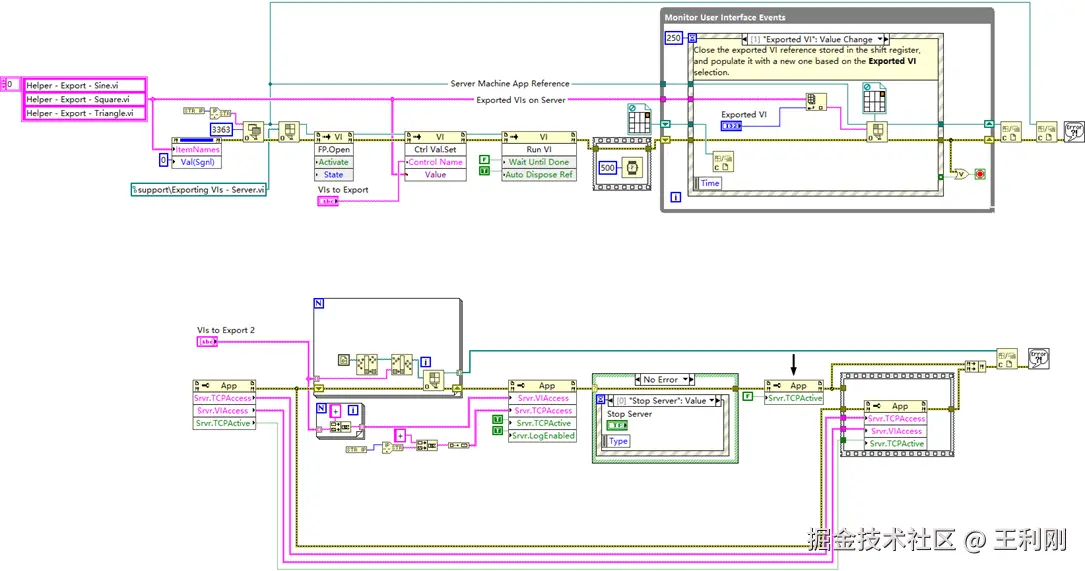 加载待导出 VI(如 Sine、Square、Triangle 计算逻辑),配置 VI Server 通信参数(TCP 端口 3363、访问权限),管理导出 VI 生命周期(启动、保持、终止)。 - 使用场合: