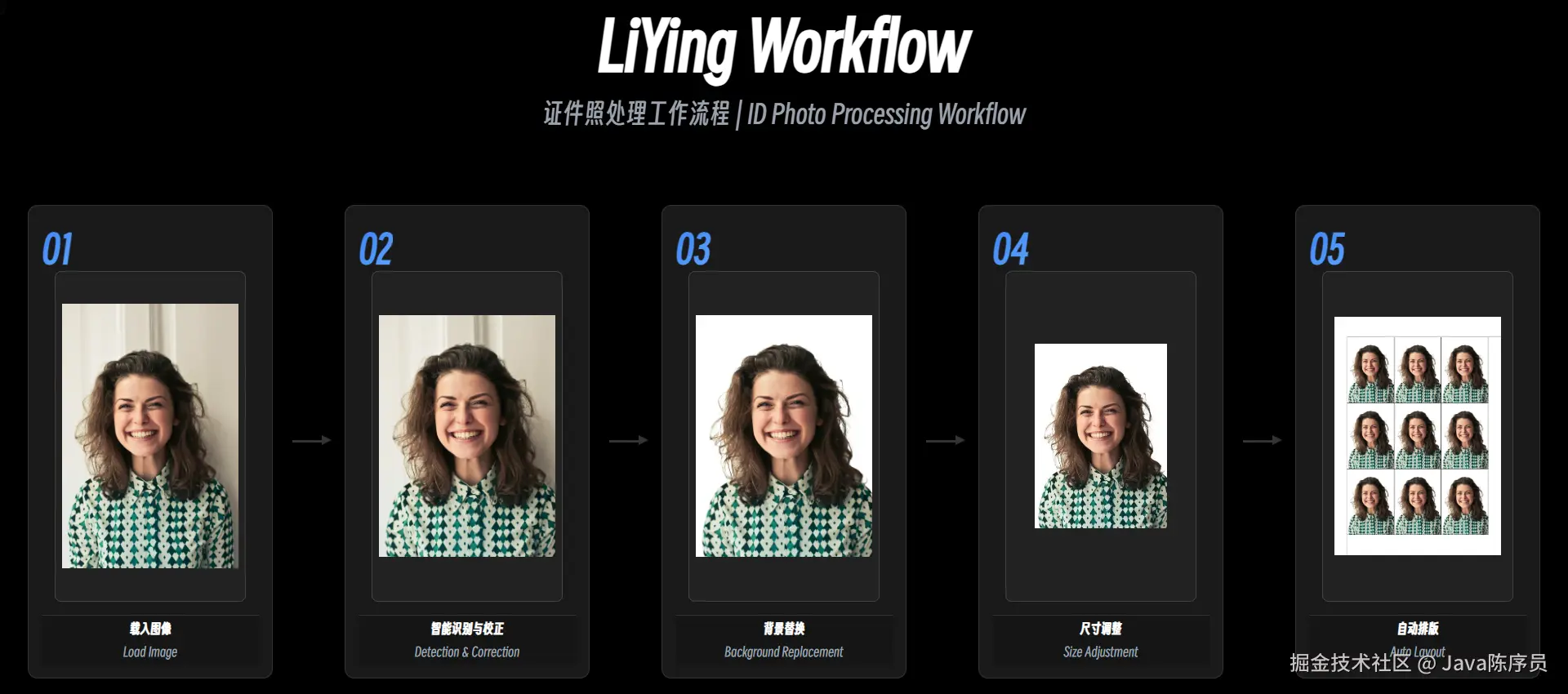 LiYing 提供了一套证件照图像自动处理的解决方案,可以帮助在本地离线快速、批量生成自定义的证件照。