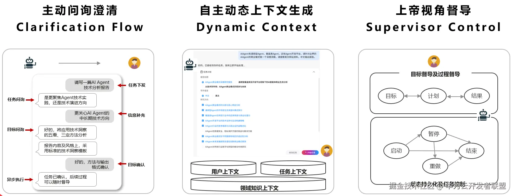 为解决企业语境下,下达任务过程不可控、Agent难以实现精准自主闭环的困境,Versatile提供三方面能力,包括主动问询澄清、动态上下文生成、上帝视角督导。