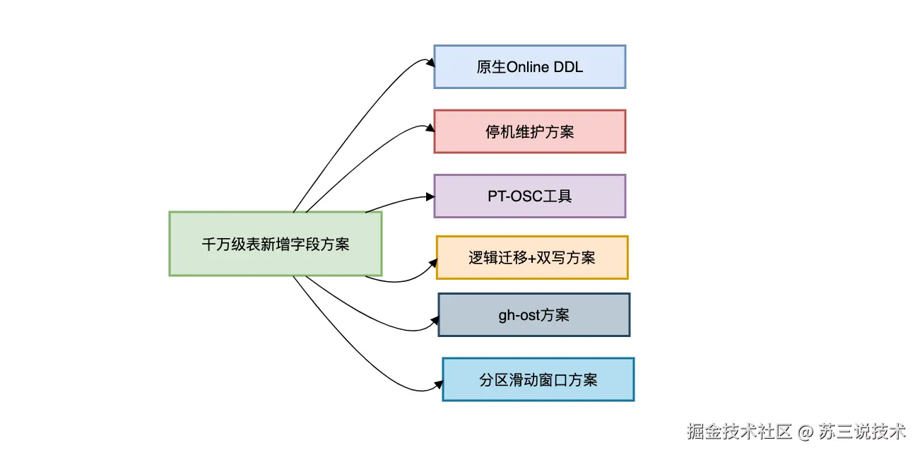 以下是针对千万级MySQL表新增字段的6种方案的对比。