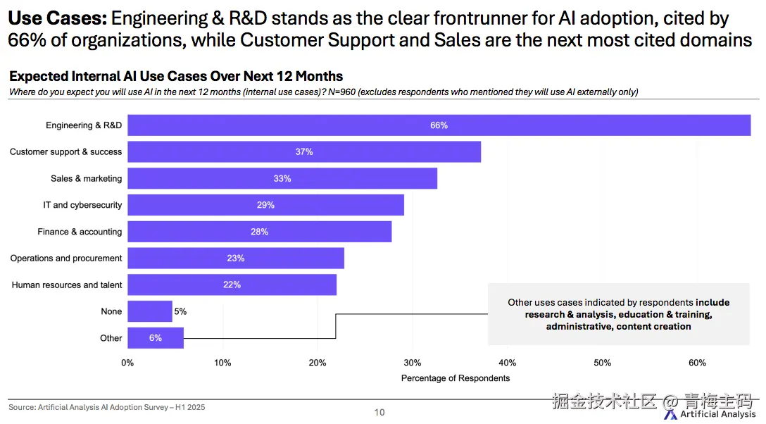 工程与研发(Engineering & R&D)以 66% 的采用率成为 AI 应用的首选领域,客户支持和销售营销紧随其后。这一趋势反映了 AI 技术在提升研发效率和优化客户服务方面的显著价值。