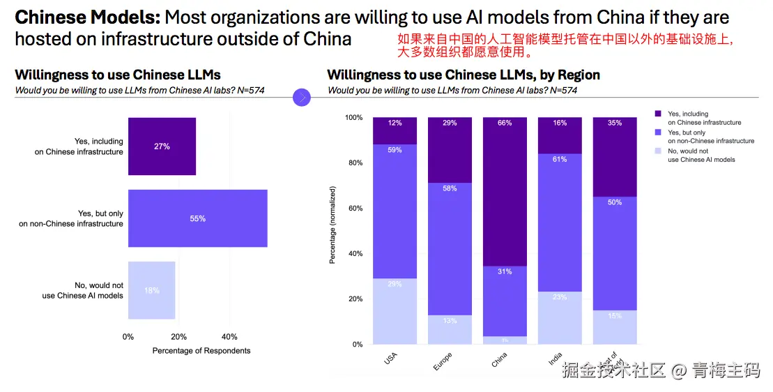 55% 的受访者表示愿意使用来自中国 AI 实验室的大语言模型,前提是这些模型部署在中国境外的基础设施上。这一数据反映了对中国 AI 技术能力的认可,同时也体现了对数据安全和合规性的关注。