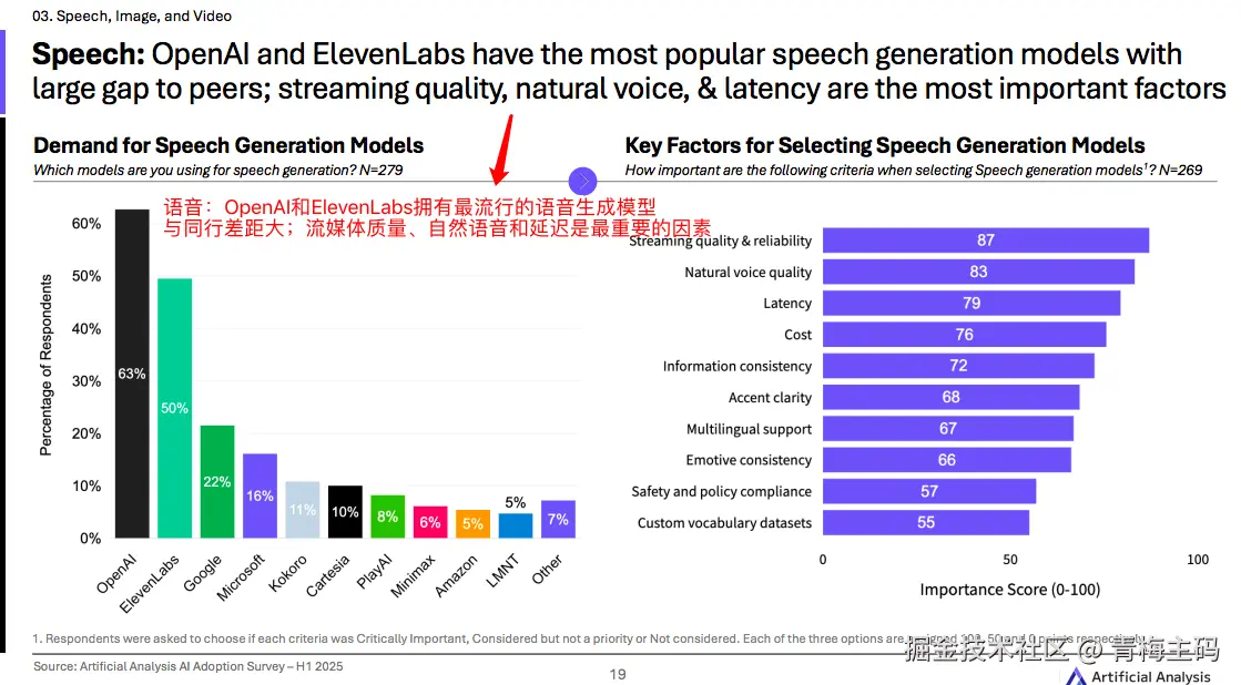 OpenAI 和 ElevenLabs 在语音生成模型方面最受欢迎,用户最重视流媒体质量、自然语音效果和延迟表现。