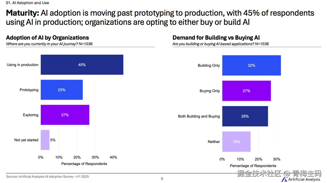 调研显示,约 45% 的组织已经将 AI 技术投入生产环境使用,标志着 AI 应用正从原型阶段向实际部署转变。在构建与购买策略方面,32% 的受访者倾向于自主构建解决方案,27% 选择购买现成产品,25% 采用混合方式。