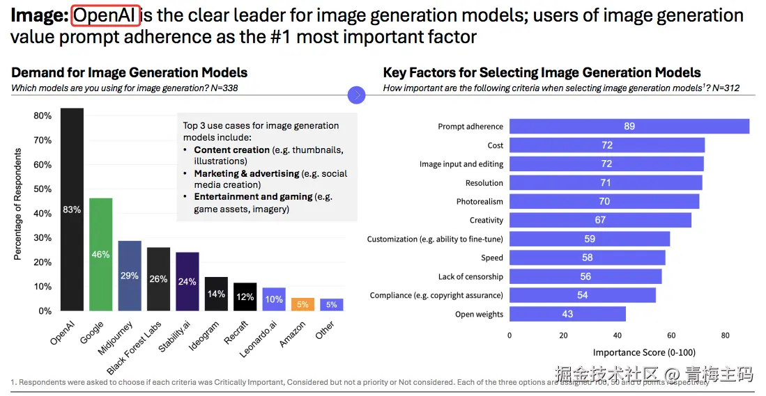 OpenAI 在图像生成模型领域处于明显领先地位,用户将提示词准确性视为第一重要因素。主要应用场景包括内容创作(缩略图、插图)、营销广告和娱乐游戏。