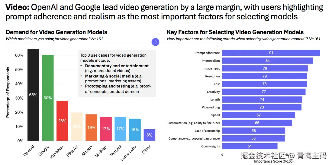 OpenAI 和 Google 在视频生成领域大幅领先,用户最看重提示词准确性和真实感。主要用途包括纪录片娱乐制作、营销社媒内容和原型测试。