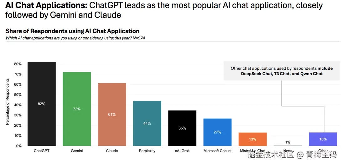ChatGPT 仍然是最受欢迎的 AI 聊天应用,紧随其后的是 Gemini 和 Claude 。其他被提及的聊天应用包括 DeepSeek Chat 、 T3 Chat 和 Qwen Chat 。