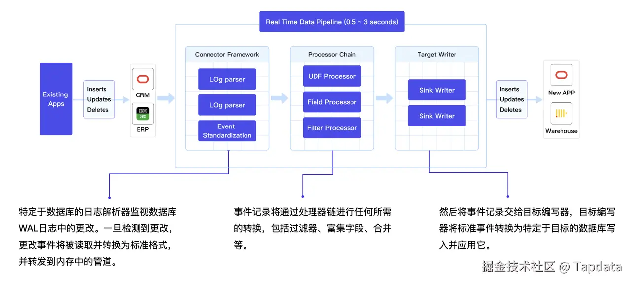 TapData 通过内置的 CDC 引擎支持基于日志的非侵入式采集,兼容 60+ 数据源类型。凭借优化的变更感知机制,采集延迟可控制在 500ms 到 3 秒之间,真正做到对源系统“零负担、零代码”的采集链路构建。