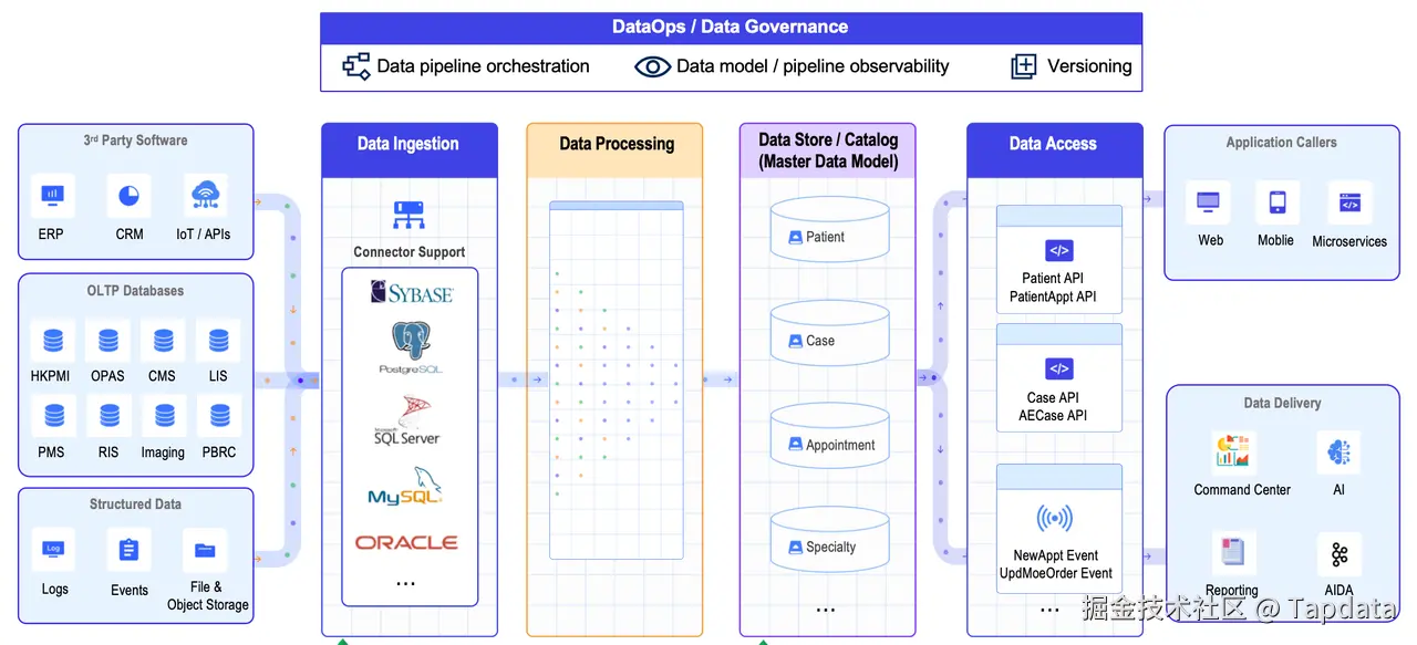 TapCDC 实时采集来自 Sybase、PostgreSQL、Oracle 等系统中的门诊、住院、预约、影像、病例等诊疗数据;