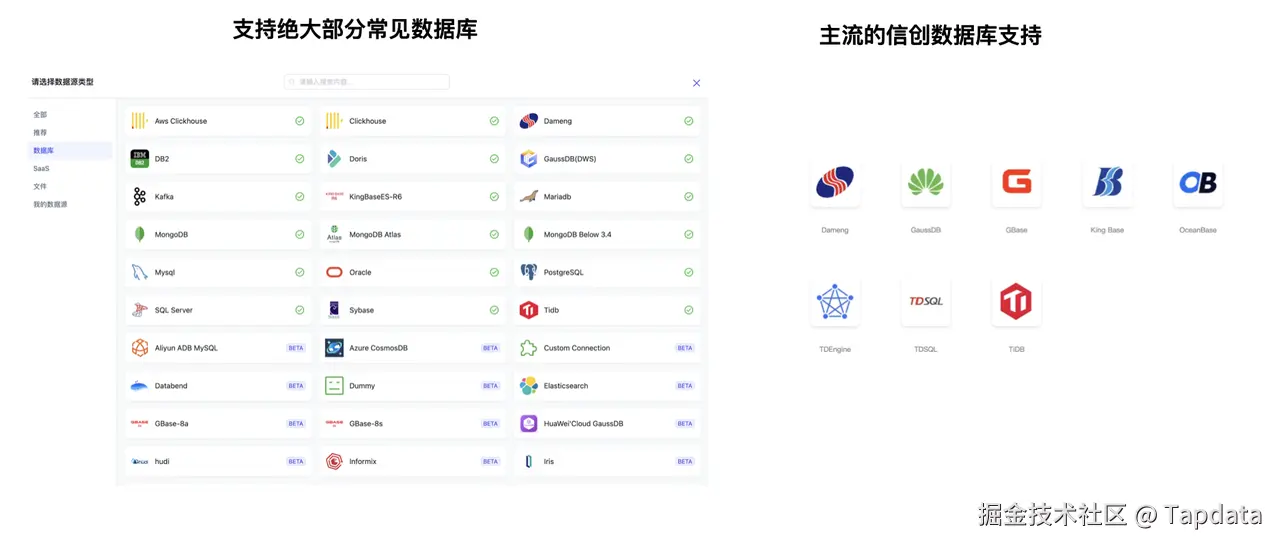 TapCDC:无需编码,支持数十种数据库的日志级 CDC 采集,已覆盖主流国产数据库(如达梦、金仓、南大通用、GaussDB);
