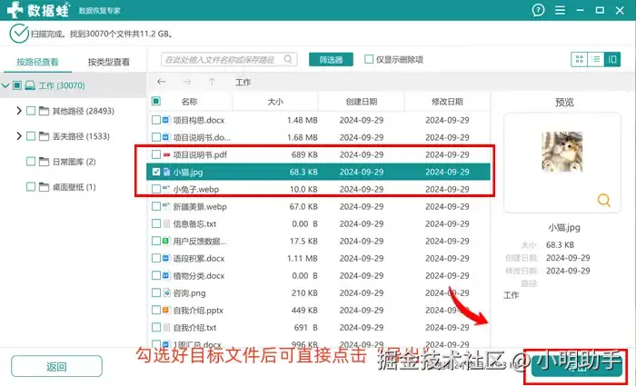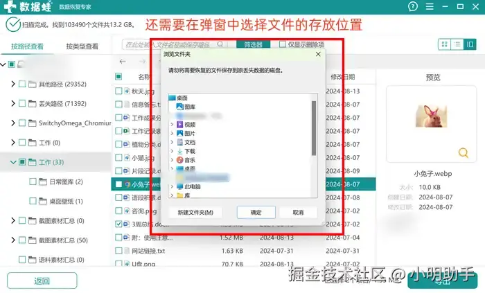 步骤2: 扫描完成后的文件会按照一定的规则进行排列(具体可通过左侧的目录进行搜索),找到目标文件后勾选,点击“导出”按钮。最后别忘了给导出文件选好“新家”。