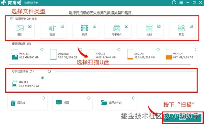 步骤1: 在软件的首页中,当我们把U盘连接到电脑后,就会在“可移动驱动器”中显示。选择好扫描位置和扫描文件类型,就能够让软件开始扫描了。