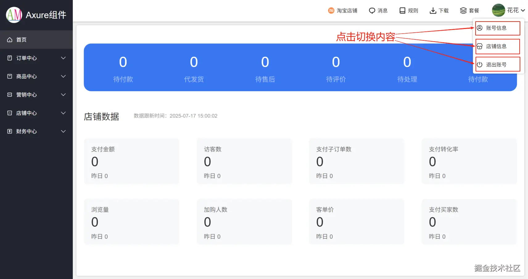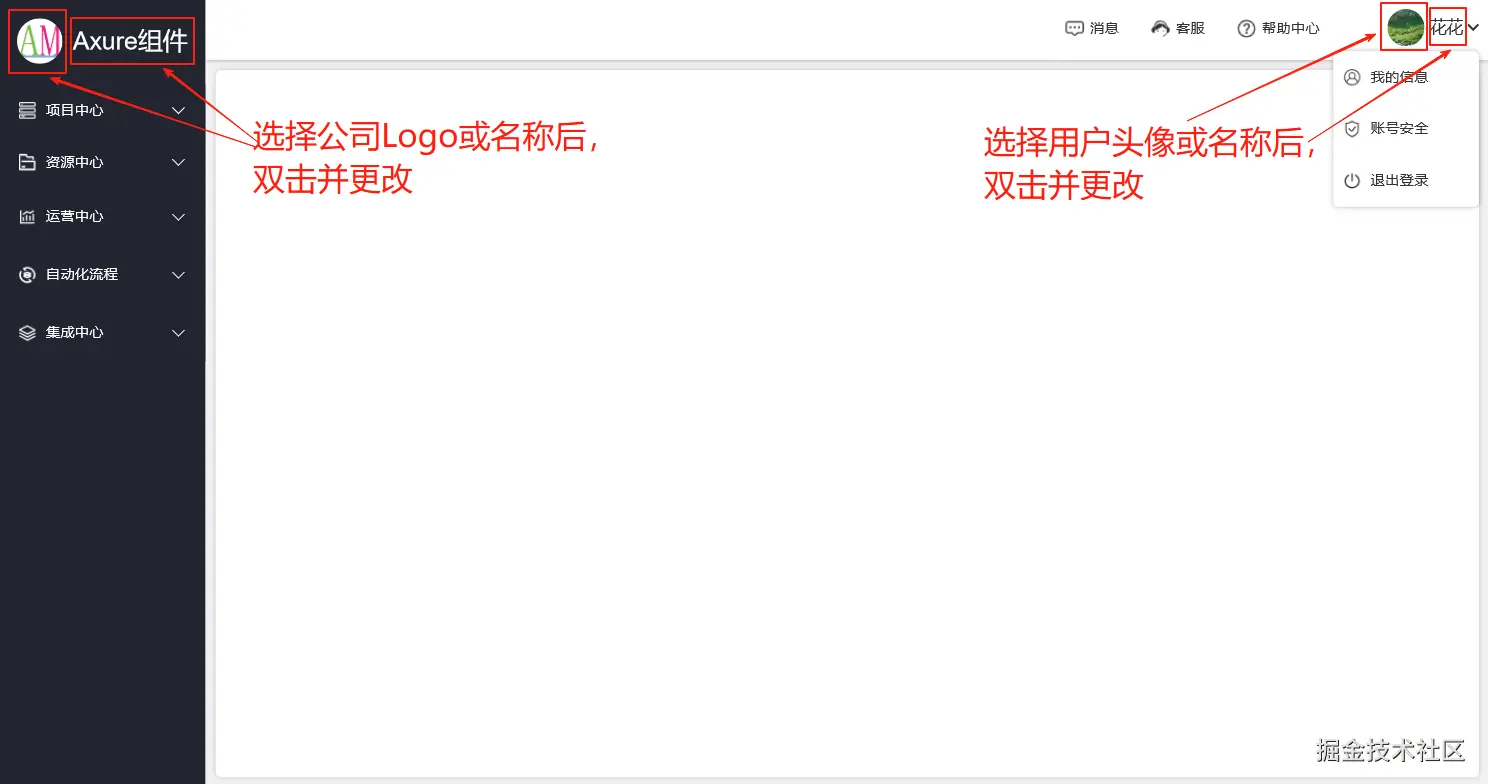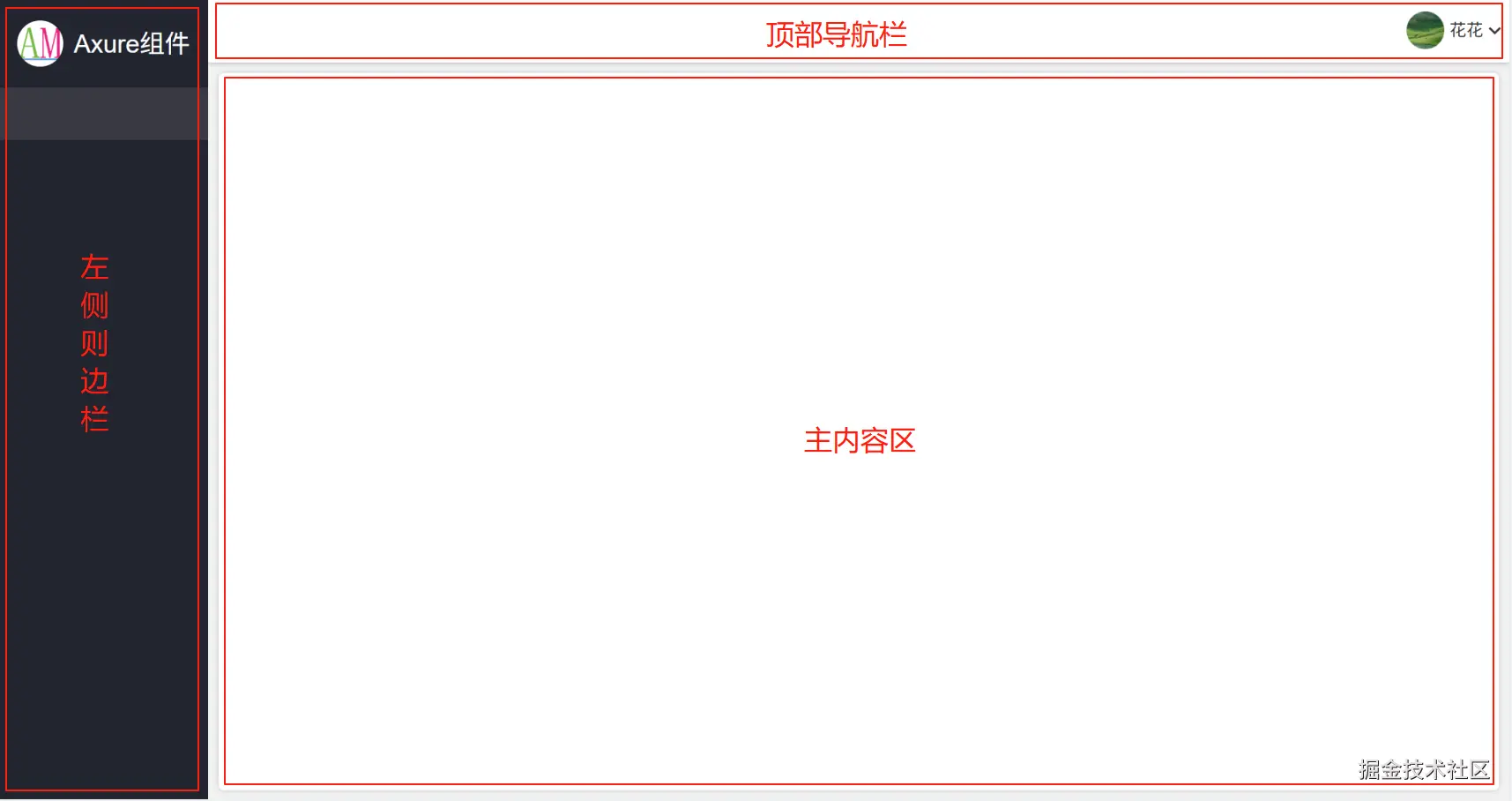 本控制台框架的布局包括顶部导航栏、左侧侧边栏和主内容区。 框架的顶部导航栏和左侧侧边栏中的交互已由代码实现,其中的数据已由中继器记录,即使用者只需在中继器中填写文本、添加图标和指定链接即可实现控制台的交互和链接跳转,而使用者只需要负责自己的内容工作。