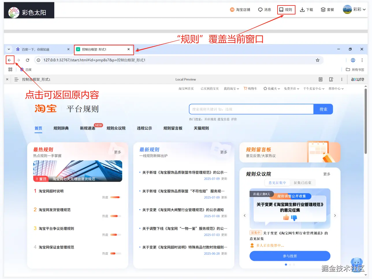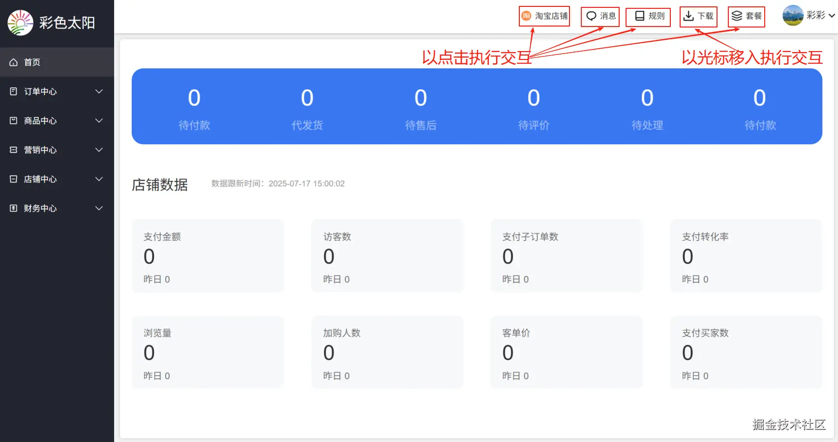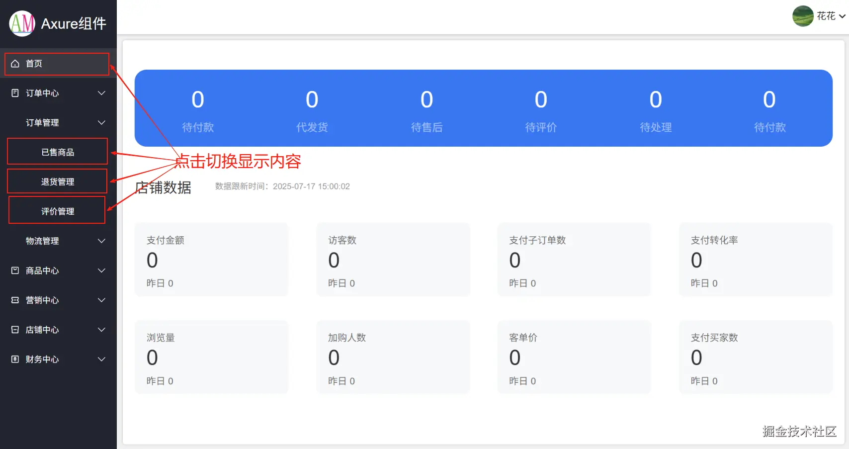 本控制台框架的布局包括顶部导航栏、左侧侧边栏和主内容区。 框架的顶部导航栏和左侧侧边栏中的交互已由代码实现,其中的数据已由中继器记录,即使用者只需在中继器中填写文本、添加图标和指定链接即可实现控制台的交互和链接跳转,而使用者只需要负责自己的内容工作。