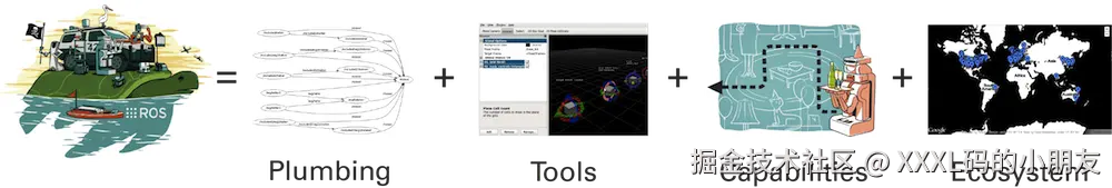 - ROS设计者将ROS表述为“ROS = Plumbing + Tools + Capabilities + Ecosystem”,即ROS是通讯机制、工具软件包、机器人高层技能以及机器人生态系统的集合体