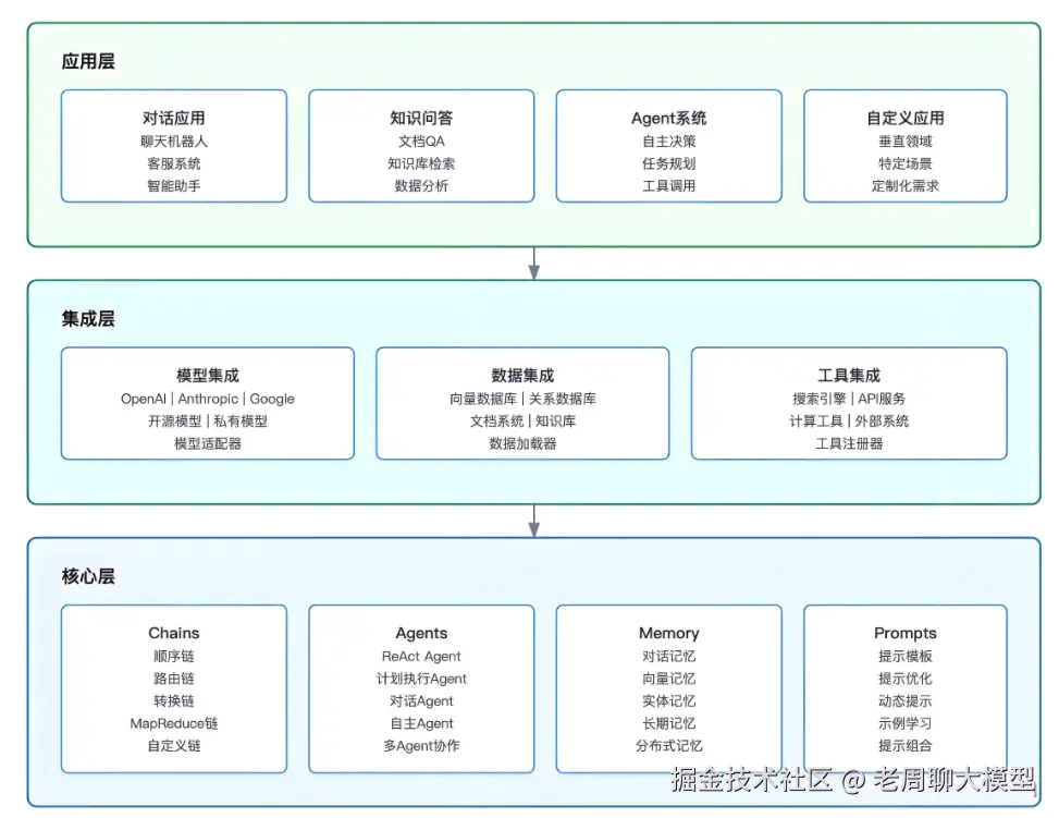 - 组件化思维:通过Chain、Agent、Memory等抽象概念,将复杂的语言模型交互拆解为可组合单元