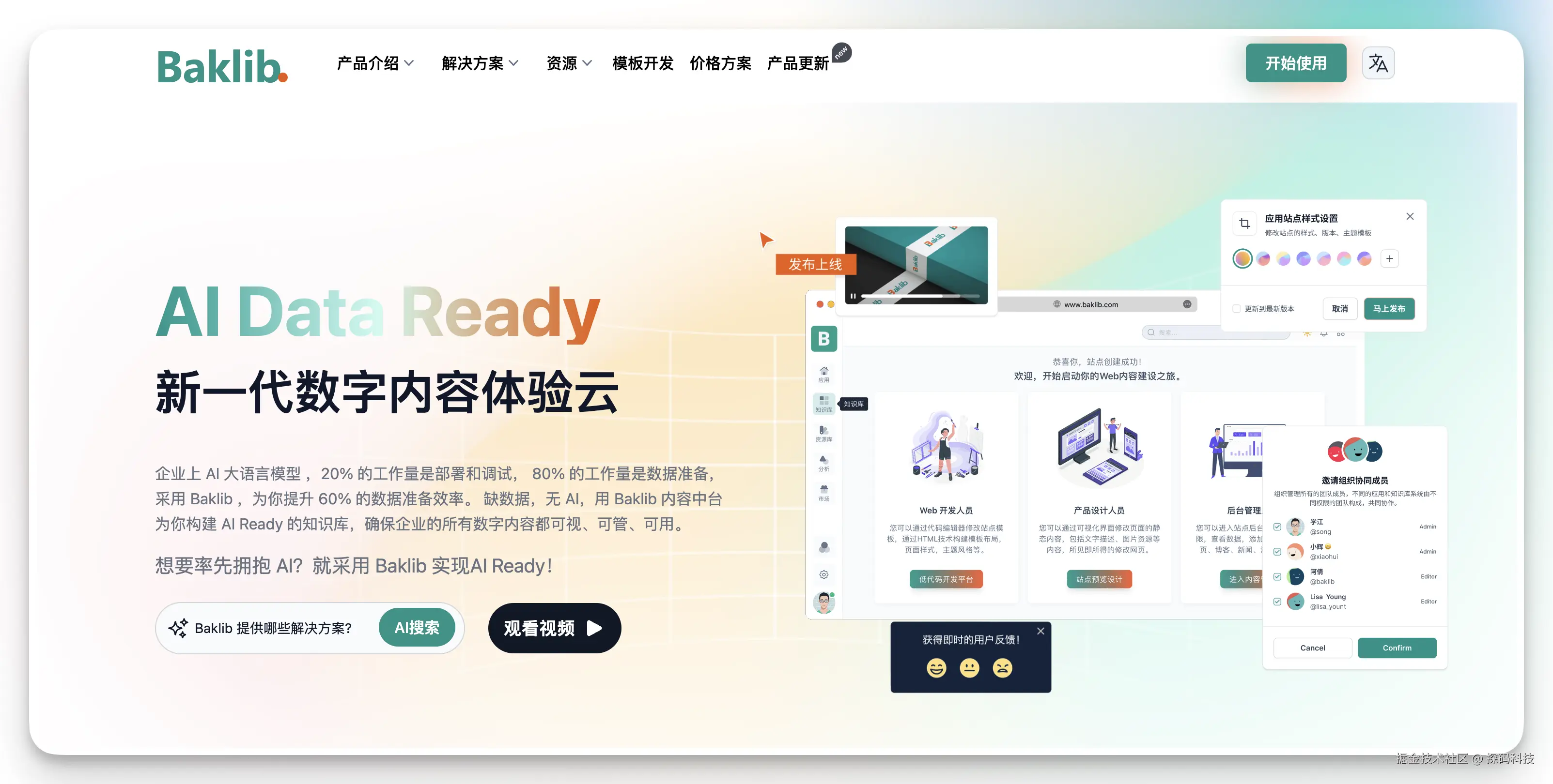 Baklib 是新一代 AI 知识库于数字体验管理平台,托管超过1000 家企业的网站和在线文档。其流行源于出色的灵活性和开源主题生态系统,使用户能够根据多样化需求定制网站、在线文档和知识库系统。Baklib独创的资源库+知识库+体验库三层架构设计,一方面满足企业一体化数字内容管理,另一方面又满足企业构建多场景的应用网站。无论是跨国多语言站点构建,还是内外部知识库建设,客户帮助中心,产品手册搭建,都在一个地方完成。选择了Baklib作为其内容管理平台,主要因其卓越的优化能力。